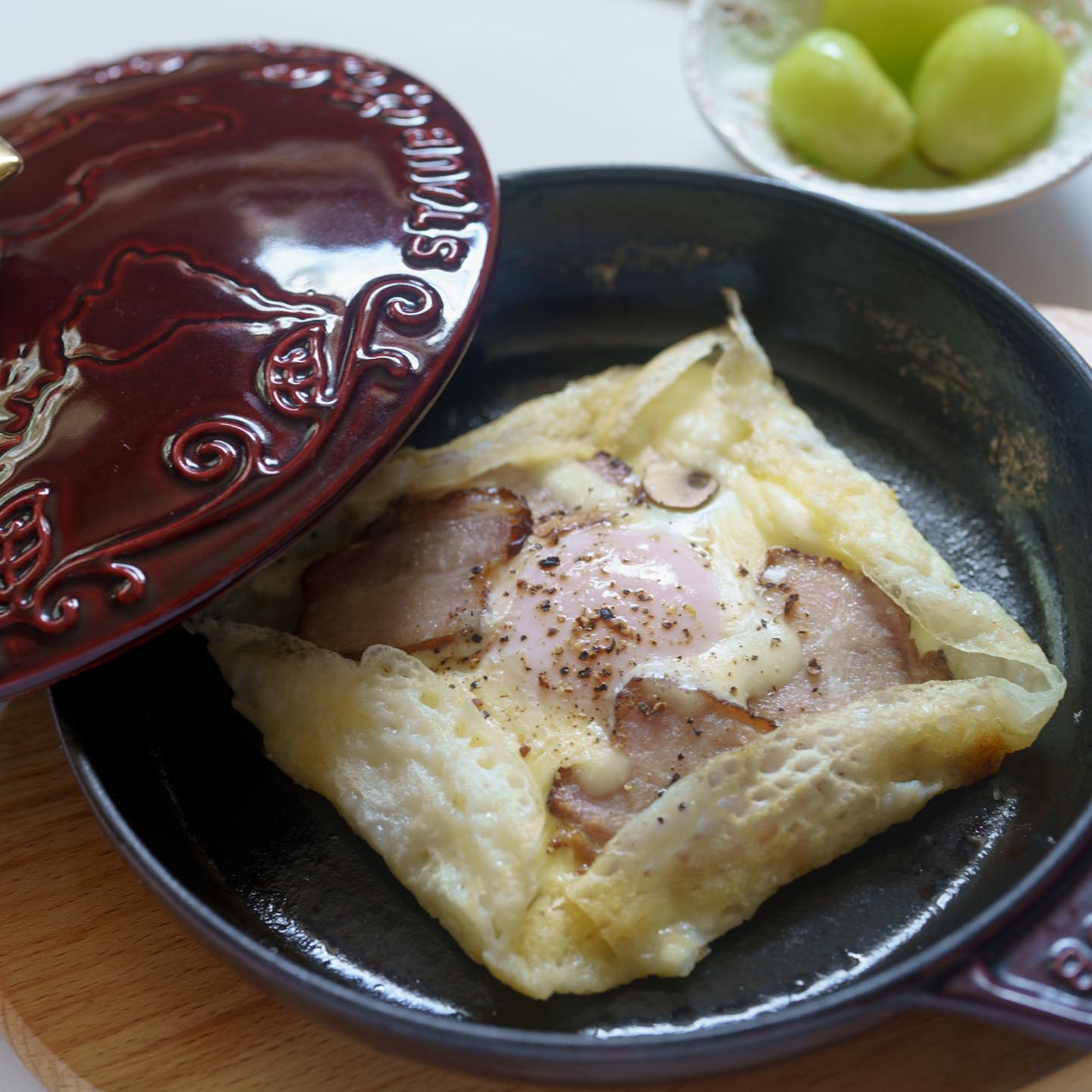 米粉のガレット。おいしかったけどさっぱりしすぎてるのてで今度は蕎麦粉買ってこよう。tomorrowちゃんのふたが可愛すぎてたまらない。